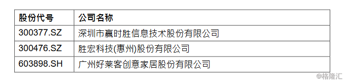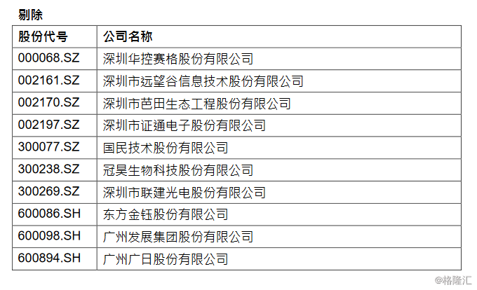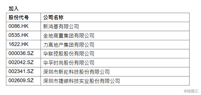 加入公司:新鸿基公司(00086.HK)、金地商置(00535.HK)、力高集团(01622.HK)、华联控股(000036.SZ)、华孚时尚(002042.SZ)、新纶科技(002341.SZ)、捷顺科技(002609.SZ)、赢时胜(300377.SZ)、胜宏科技(300476.SZ)、好莱客(603898.SH)。