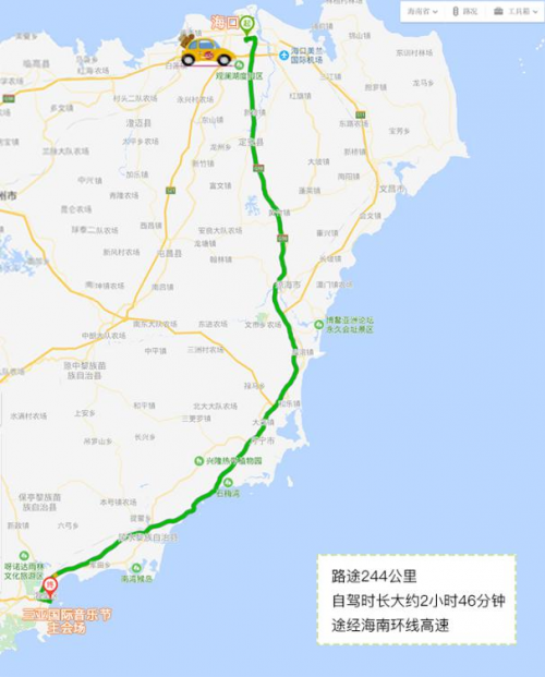 从海口市出发的Raver们自驾至三亚国际音乐节主会场,途径海南环线高速,路途大约244公里,大概需要2小时46分钟。