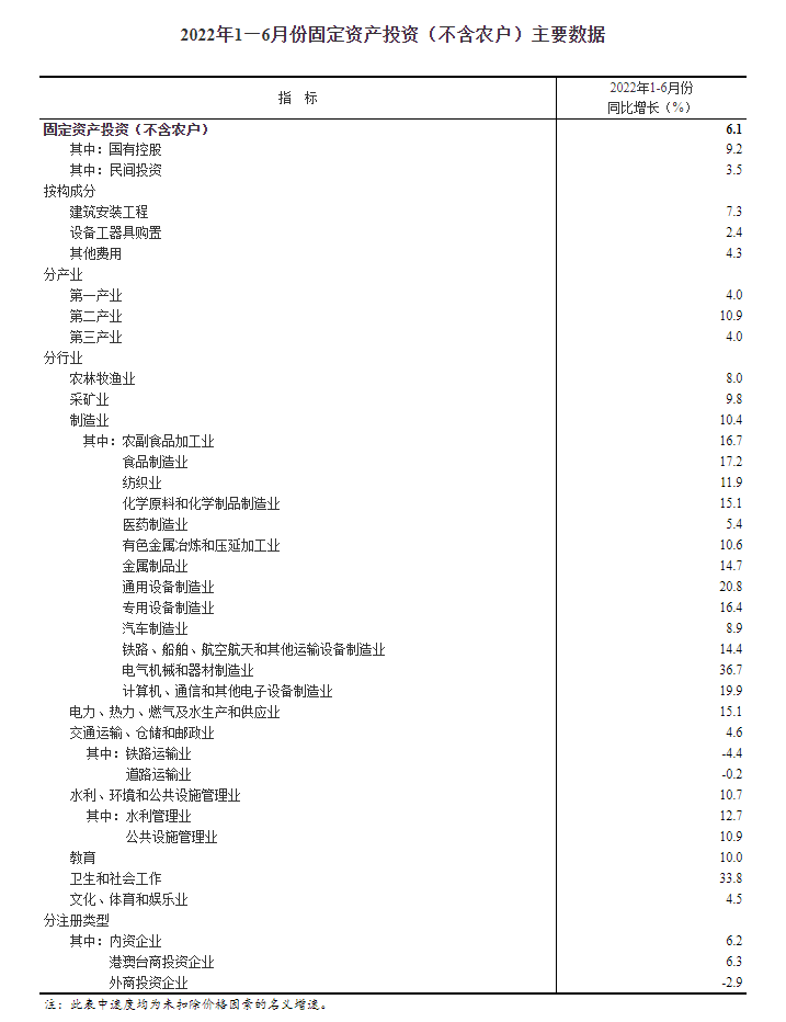 2022年1—6月份全国固定资产投资(不含农户)增长6.1%
