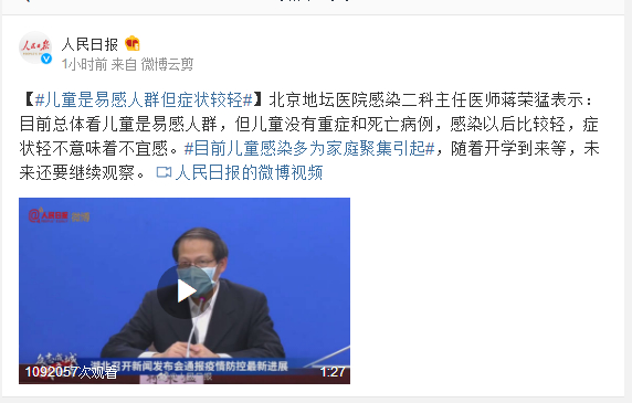 北京地坛医院感染二科主任医师蒋荣猛表示:目前总体看儿童是易感人群,但儿童没有重症和死亡病例,感染以后比较轻,症状轻不意味着不宜感。#目前儿童感染多为家庭聚集引起#,随着开学到来等,未来还要继续观察。