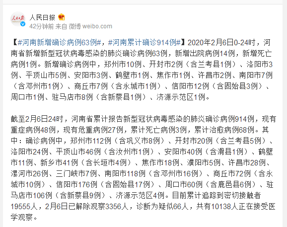 2月6日0-24时河南新型肺炎新增确诊病例63例 河南累计确诊914例