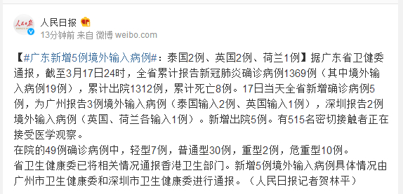3月17日广东新增5例境外输入病例:泰国2例、英国2例、荷兰1例