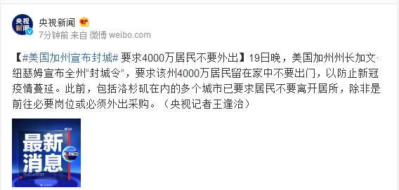 19日晚,美国加州州长加文·纽瑟姆宣布全州“封城令”,要求该州4000万居民留在家中不要出门,以防止新冠疫情蔓延。此前,包括洛杉矶在内的多个城市已要求居民不要离开居所,除非是前往必要岗位或必须外出采购。(央视记者王逢治)