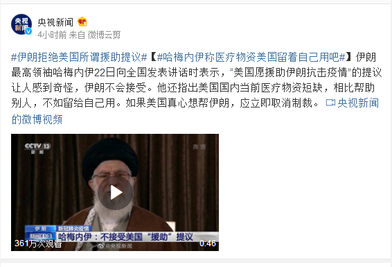 伊朗拒绝美国所谓援助提议 哈梅内伊称医疗物资美国留着自己用吧