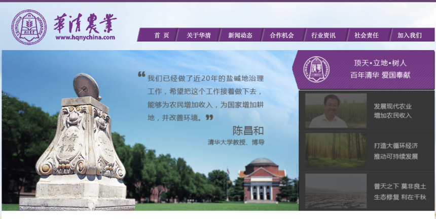 华清农业开发有限公司以清华大学盐碱地区生态修复与固碳研究中心为依托,以“清华大学利用燃煤烟气脱硫凌弃物改良盐碱地”国家发明专利为基础,整合技木,资金和相关安源,打造专业化、规模化的盐碱地改良和农业全产业链管理平台,实施清华大学“利用燃煤烟气脱疏废弃物改良亿亩碱化土壤重大工程”,推动农业现代化进程与社会经济可持续发展。