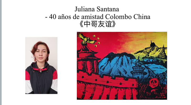 哥著名画家、文化部艺术司顾问托巴尔,对青年组二等奖桑塔纳的《中哥友谊》(JulianaSantana-40añosdeamistadColomboChina)给予高度评价,他说,作者将代表中哥独特文化元素的长城、天坛、古城堡、熊猫、山鹰等完美地融合在一起,组成了一幅极具史诗般力量的风景画。作者巧妙地将中哥两国国旗颜色作为画面的主色调,使整个画面色彩斑斓、相得益彰,足见作者的奇思妙想和真挚情感!