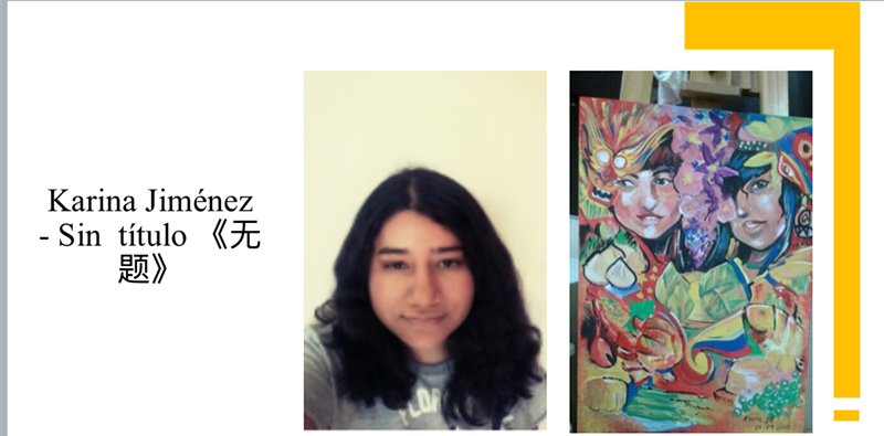 哥最高法院大法官萨那布利亚,对成人业余组二等奖卡丽娜的《无题》(KarinaJiménez-Sintítulo)非常喜爱,他说《无题》这幅绘画是略有抽象感的一幅作品,极富创意和想象力。东方少女与印第安少女清纯天真、充满梦幻。代表中国的龙、果实和代表哥伦比亚的亚马逊蝴蝶,巧妙地变换成少女的发饰,五星红旗和哥伦比亚国旗,华丽地装扮在中哥两名少女身上,她们宛若姊妹、紧紧相拥,象征中哥友谊血浓于水,象垂在少女间的兰花一样,香飘四溢,历久弥新。