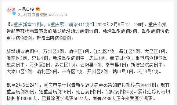 2月6日12-24时重庆新型肺炎新增11例 重庆累计确诊411例