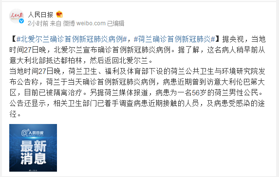 北爱尔兰确诊首例新冠肺炎病例 荷兰确诊首例新冠肺炎