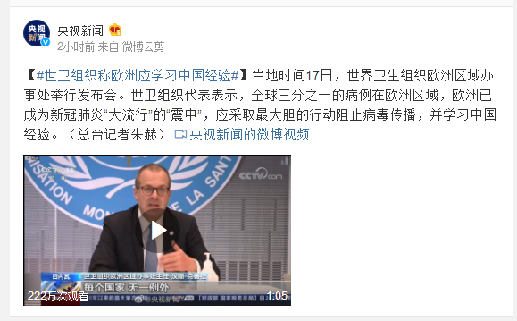 2020-03-18 10:27 来源:央视新闻微博 字号: