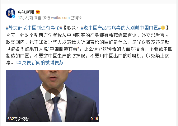 外交部驳中国制造有毒论-耿爽:说中国产品带病毒的人别戴中国口罩