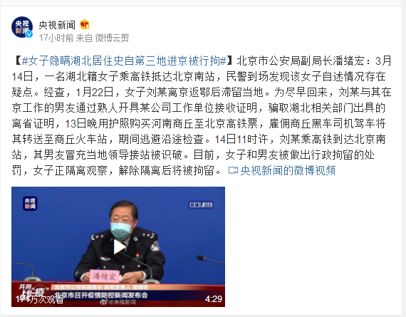 北京市公安局副局长潘绪宏:3月14日,一名湖北籍女子乘高铁抵达北京南站,民警到场发现该女子自述情况存在疑点。经查,1月22日,女子刘某离京返鄂后滞留当地。为尽早回来,刘某与其在京工作的男友通过熟人开具某公司工作单位接收证明,骗取湖北相关部门出具的离省证明,13日晚用护照购买河南商丘至北京高铁票,雇佣商丘黑车司机驾车将其转送至商丘火车站,期间逃避沿途检查。14日11时许,刘某乘高铁到达北京南站,其男友冒充当地领导接站被识破。目前,女子和男友被做出行政拘留的处罚,女子正隔离观察,解除隔离后将被拘留。