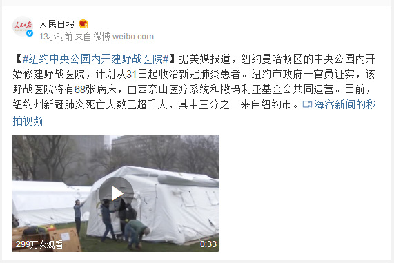 据美媒报道,纽约曼哈顿区的中央公园内开始修建野战医院,计划从31日起收治新冠肺炎患者。纽约市政府一官员证实,该野战医院将有68张病床,由西奈山医疗系统和撒玛利亚基金会共同运营。目前,纽约州新冠肺炎死亡人数已超千人,其中三分之二来自纽约市。