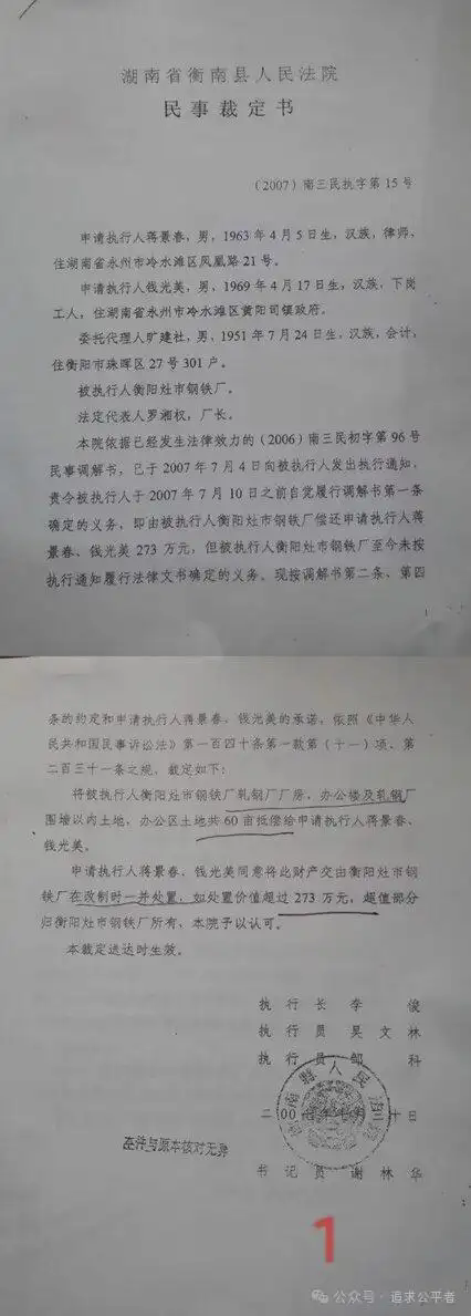 二、我们合法持有灶钢4879万有效抵押债权,在和灶钢方洽谈中,我们再三权衡之后,自愿仅收取273万元,但前提是灶钢须于2007年6月30日前以现金给付,逾期则以“办公楼、灶钢厂房及附属的土地60亩抵偿”,经衡南县法院调解,以(2006)南三民初字第96 号民事调解书确认生效。由于灶钢没有按规定时间给付273万元,债权人申请衡南县法院执行,法院以(2007)南三民执字第15号民事裁定书裁定“调解书约定的抵债财产归债权人所有”(图1),同时还裁定根据债权人的授权将抵债财产交与灶钢在改制时一并处置,只收取273万,但时间止于2007年12月31日”。由于被授权人灶钢再次违约,即在规定时间内没有改制处置,依据执行裁定,抵债财产毫无疑义属于我们债权人所有。然而,衡阳市国资委主任白润民在主持灶钢破产清算中,身为清算组组长,因没有得到我们债权人的利益输送(白润民通过第三者----当时的破产清算副组长罗湘权暗示我们给他以好处),恼羞成怒,将执行抵债的房产及附属60亩土地违法处置给泓湘公司,致我们的合法财产全部损失,现值至今逾4000万。举报人曾数十次地向衡阳纪监委、检察机关举报,但遭遇的是“有案不立、压案不究”,包庇犯罪。