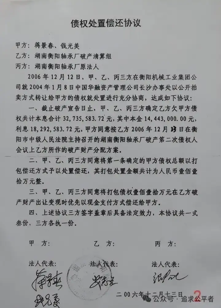 一、我们合法持有衡阳市轴承厂(以下简称衡轴)3700万有效抵押债权,该企业破产清算中,清算组多次与抵押债权人协商,达成了给付110万即了结全部债务的协议(图2),可破产清算终结已18年,但衡阳市国资委主导的企业改制公然阻止付款,至今未给我们债权人分文。