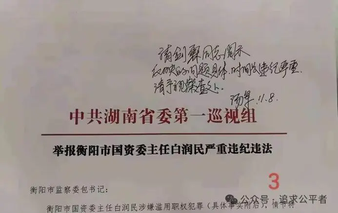 2008年11月8日,原湖南省纪委副书记汤军签字督办,原文为:请剑霖同志阅示,反映的问题具体、时间长、违纪严重,请予视察查处(图3)。